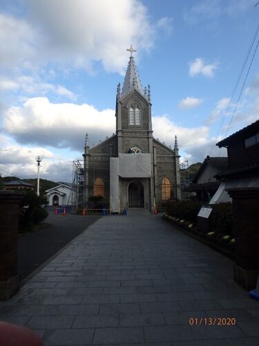 﨑津教会は「海の天主堂」とも呼ばれ、尖塔の上に十字架を掲げた重厚なゴシック様式 の建物です。 3月中旬までは工事のために 足場が組まれています。 﨑津教会に向かう途中「天草コレジヨ館」を見かけた。 開館前の8時10分着なので、 今回は見学はできない…