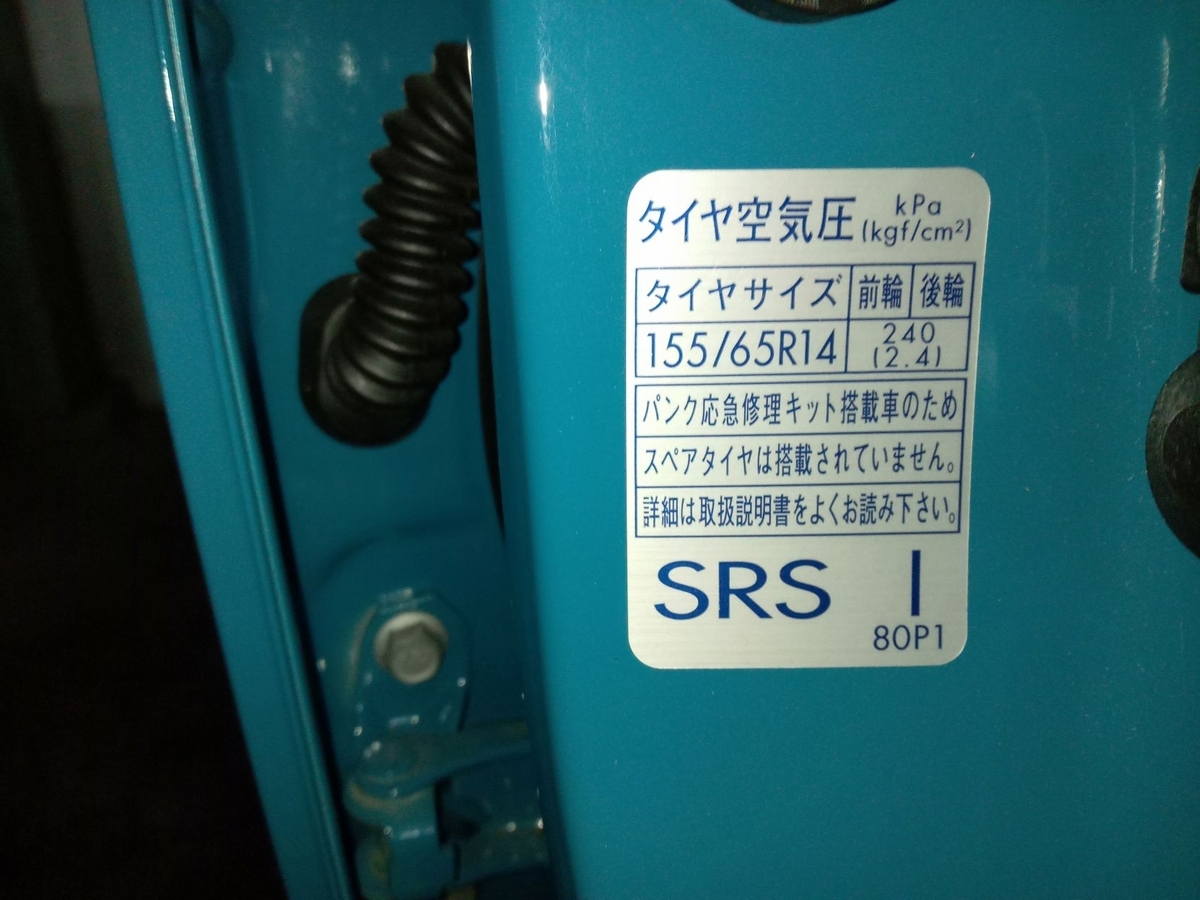 前輪/後輪共に 240kPaで、タイヤサイズは 155/65R14。